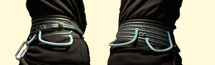 Další velmi důležitou částí sedáku jsou materiálová poutka. V tomto případě nemám co vytknout, pokud jde o jejich konstrukci či trvanlivost. Poutka nejsou tvarově asymetrická, mají víceméně pravidelný obdélníkový tvar, lehce odstávají od těla sedáku a materiál se na ně zapíná rychle a pohodlně. Jsou potažena látkou a za dobu mého používání (1 rok – stěna, skály, zimní hory) nevykazují žádné mechanické poškození. Problematičtější je to s jejich umístěním na bederním úvazku. Přední poutko je umístěno dobře, ale zadní je na můj vkus až příliš vzadu. Když jsem do něj zvláště s batohem na zádech a tlustou péřovkou na sobě chtěl zapnout nebo naopak vycvaknout nějaký materiál, dalo mi to vždy celkem zabrat a záda sem si mohl ukroutit..
