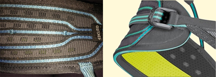 Vlevo detail bederního pásu. "Nosné" popruhy jsou velmi tenké a je tak prostor pro dostatečné a efektivní odvětrávání celého úvazku. Pěnová hmota uvnitř je perforovaná. Vpravo pak detail stahovací spony.