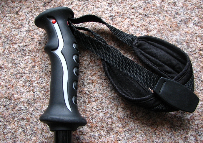 Mezi důležité součásti patří pozitivně tvarovaná rukojeť, která je gumová (výrobce uvádí tzv. T7 dual grip). Nutno dodat, že rukojeť se při nízkých ani vysokých teplotách nedeformuje a neklouže, je tedy velmi univerzální a ani po čtyřech letech užívání nejeví znaky opotřebení. Samozřejmostí je polstrovaný pásek (poutko) na ruce, který lze automaticky povolit (vysunutím nahoru) a následně sevřít. Polstrování je dostatečně měkké a zaručuje příjemný pocit Vašich rukou i při delším užívání holí.