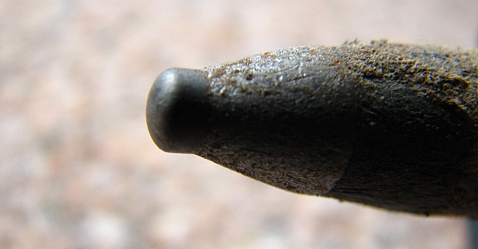 Karbidový hrot má tvar pozitivní hvězdičky. Po čtyřech letech pak vypadá jako na obrázku...