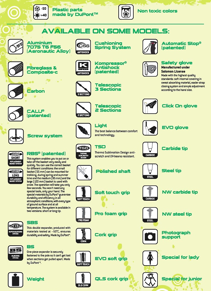 Z technického hlediska se jedná o klasické třídílné teleskopické hole, jednotlivé díly jsou spojeny patentovanou technologií - SBS (Super Blocking System). Jedná se o plastovou rozšířitelnou vložku (výrobce: DuPont), která je našroubována na hliníkovém závitu. Když tedy chceme holi utáhnout, plastová vložka (červená) se šroubováním roztáhne a teleskopická hůl je utažená a připravená k použití.