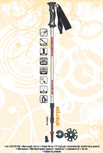V této recenzi se zaměříme na jednu z žádaných outdoorových pomůcek - teleskopické hole. Italská firma Masters patří mezi tradiční výrobce a my jsme si již před lety vyhlédli model Sherpa, který Vám představíme. Důležitým faktem je i to, že se tento model stále vyrábí a tak je i tato recenze stále aktuální. Dříve se hole vyráběly ve dvou barevných provedeních - černé a stříbrné, v současnosti se vyrábí již pouze stříbrná varianta.