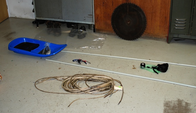 Jako vodící tyče jsem využil PVC trubky pro rozvod vody o síle 20mm, vnitřní průměr 14mm, nejsou sice nejpevnější, poskytnou ale základní ochranu tažnému lanku a unesou i menší tlaky při sestupu z kopce, Příliš strmým terénem se ale v polární krajině pohybovat nebudeme. Pokud prasknou za nízkých teplot, budu saně tahat jen na lanku. Cena 70 kč/4m. Nakonec jsem na každou stranu použil 160 cm.