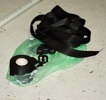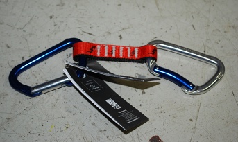 Celní lanko o průměru 8mm, jeho výhodou je, že lano je potáhlé gumovou hadičkou, tím pádem je dobře chráněno proti mechanickému poškození. Metr délky se dá sehnat asi kolem 12kč, nám stačí 4 metry délky. Dále využijeme klasickou expresku na horolezectví, karabiny rozpojím a použiju je k uchycení vodících tyčí saní k batohu, ještě lépe poslouží uzamykatelné karabiny, např. HMS. Cena 300kč.