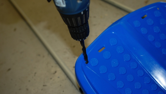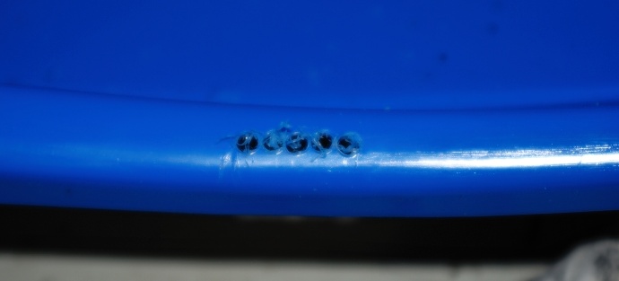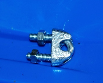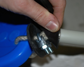 Nejdříve je třeba vyvrtat nové otvory pro uchycení tažného systému, původní jsou totiž příliš blízko u sebe. Uzel se na celním lanku dělá těžko, proto je třeba ho stáhnout touto stahovačkou. Potřebujeme 4 ks, cena jednoho je 5kč. Aby stahovačka neponičila boby, z obou stran jsem z gumy vyrobil ochranné kroužky, použil jsem starou zástěrku z motorky.
