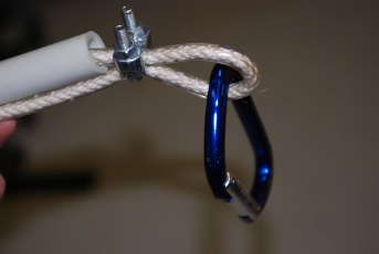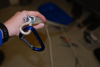 Lano potažené gumovu hadičkou, vpravo expresní karabina.