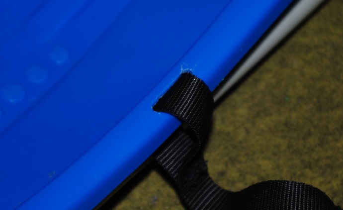 Nyní je třeba vytvořit oka v rámu bobu pro stahování nákladu, nejdříve navrtat…, pak propilovat a našít správnou délku popruhu. Jako druhé oko jsem využil úchytu pro brzdy.
