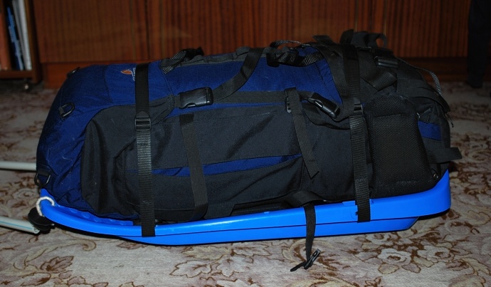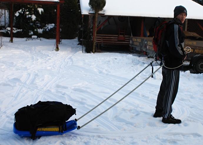 A může se začít testovat... Jako zátěž jsem použil naloženou krosnu + pod ní 10kg pytel granulí pro psa :) , nevypadá to hezky, ale důležitá je hmotnost. Saně jsem k batohu připnul nejdříve za oka na bederáku pro lezecký materiál, nepříjemně to však při naložení tahalo, proto se zatím jako nejlepší varianta jeví připnutí za oka pro uchycení lyží na batoh.