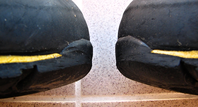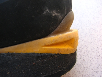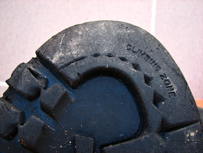 Detailní pohled na ukončení podrážky. Drážka na mačky je umístěna pouze v zadní části.