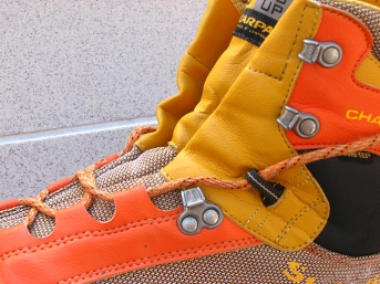 Oba použité materiály jsou v zadní části doplněny drážkou na mačky, která je vyrobena z odolného plastu. Už při prvotním pohledu je jasné, že při zimním horolezectví nebo ledovcové turistice budou nejvhodnější kloubové poloautomatické mačky. Já osobně používám model Cassin C12 a nutno dodat, že na botách sedí perfektně.