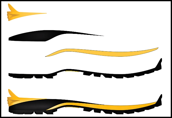 Tato podrážka je příjemně "měkká" (je vyrobena z kombinace nízkohustotního (žlutá barva) a vysokohustotního pěnového materiálu (černá barva pod patou). Výborně tak absorbuje nárazy a otřesy, bohužel se však rychleji odírá. Tento fakt lze pozorovat po dvou letech intenzivního používání zejména v přední části boty (viz. obrázek vlevo dole).